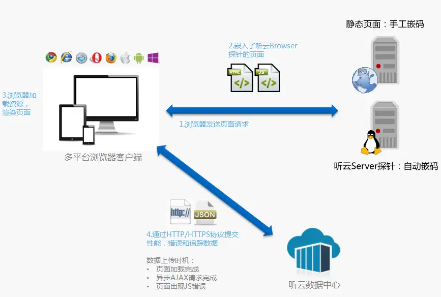 基调听云Web是采用在页面嵌入JS探针的方式获取数据,当用户通过各种设备的浏览器向服务器发起页面请求时,服务器返回嵌入基调听云浏览器探针(JS探针)的页面,浏览器对该页面进行资源加载、页面渲染等性能数据进行记录,基调听云浏览器探针会将性能数据、错误数据通过HTTP/HTTPS协议上传到数据中心,然后将这些数据进行统计汇总生成可视化图表供客户分析查看。
