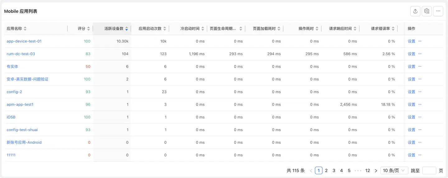 终端应用监控用户手册Mobile本页总览快速入门 在导航栏中选择终端应用,进入应用列表页面,该页面展示所有安装了 Mobile SDK的应用。列表展示应用名称、用户体验评分、活跃设备数、启动次数、启动时间、可交互时间、首屏时间、操作时间、请求响应时间、请求错误率、崩溃率和卡顿率。支持通过应用名称搜索应用。 新建应用