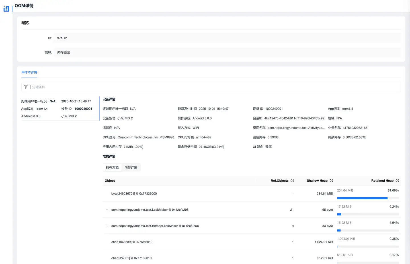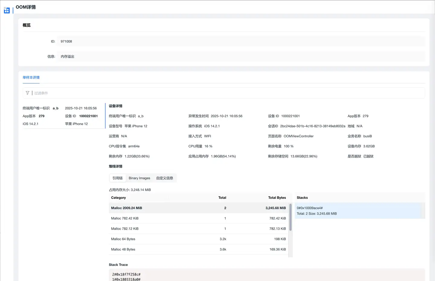 OOM 详情是当前设备发生 OOM 异常事件的详情信息,详情页面区分 Android 和 iOS 操作系统。