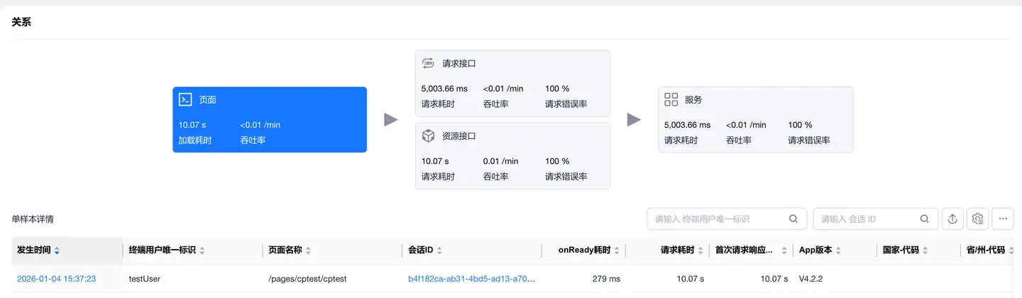 展示小程序单一页面加载与后端服务的完整链路,帮助分析性能瓶颈。