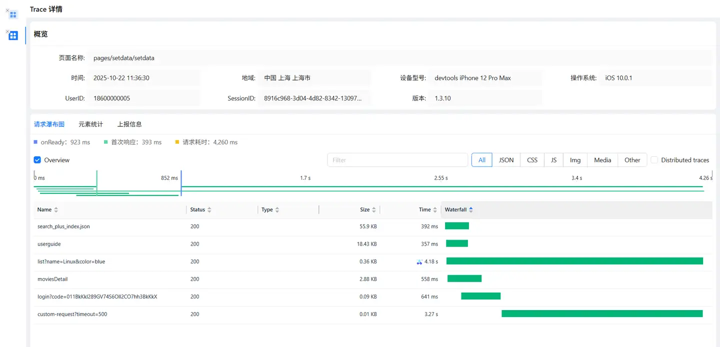 点击详情列表timeStamp,进入到Trace 详情追踪页面,该页面展示了页面加载过程中的请求信息。