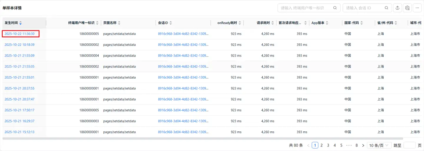 页面分析提供应用中所有页面的性能分析数据,并可对每个页面的性能进行表现评价、趋势图和分位图分析、地域分析、汇总瀑布图分析和页面详情追踪。