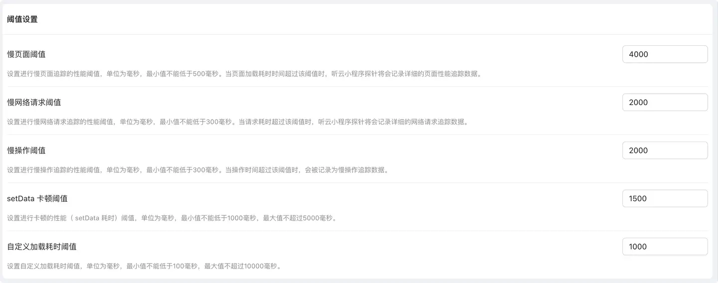 自定义慢页面阈值(加载耗时阈值)、慢请求阈值、慢操作阈值、setData卡顿阈值和自定义加载耗时阈值。