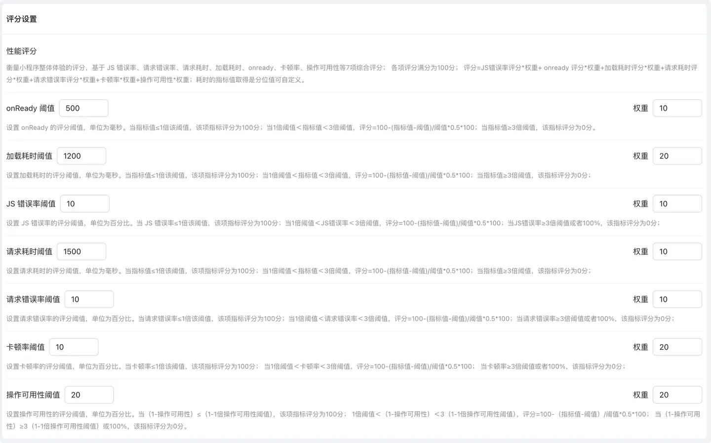 衡量小程序整体体验的评分,基于 JS 错误率、请求错误率、请求耗时、加载耗时、onready、卡顿率、操作可用性等7项综合评分。各项评分满分为100分。公式如下: