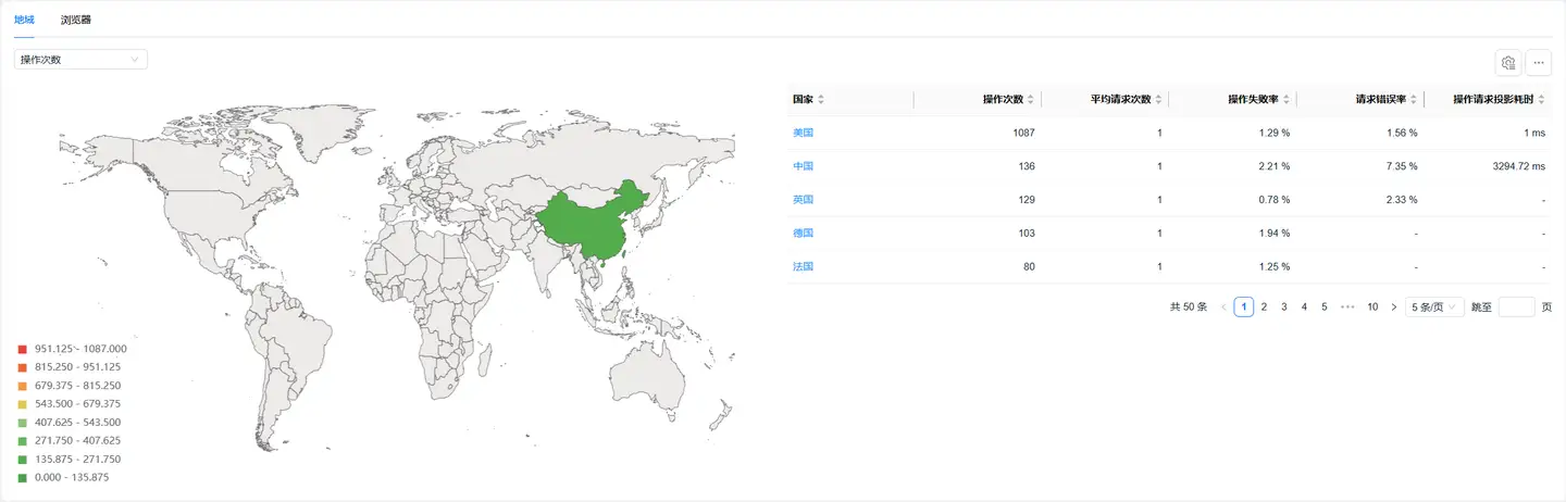 - 您可以在左侧筛选操作性能指标来分析其在不同地域的表现情况