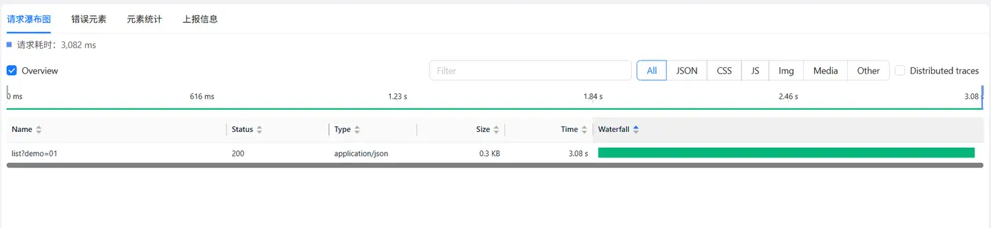 选中请求接口卡片,底部展示「mime-type 为 text 或 json」请求数据列表,列表展示数据包括: