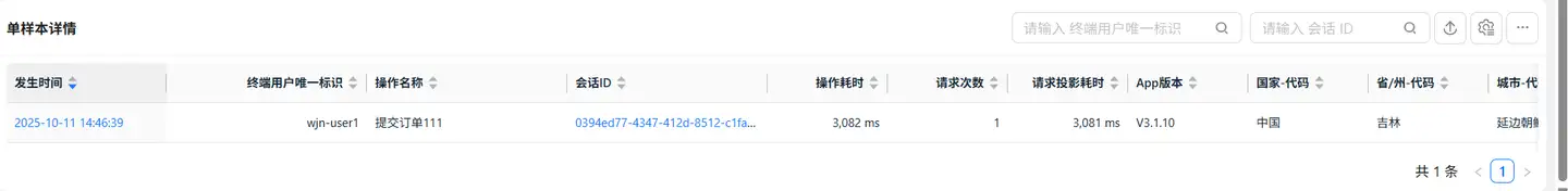 默认选中操作卡片,底部展示操作性能数据列表,列表展示数据包括: