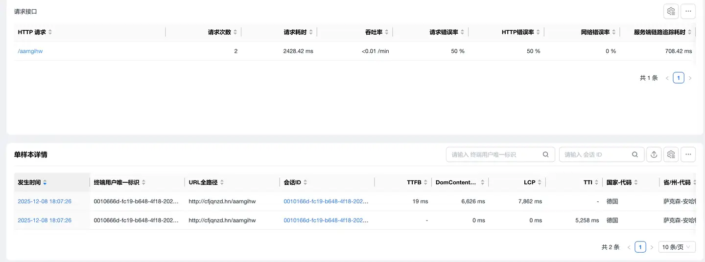 默认选中页面卡片,底部展示页面性能数据列表,列表展示数据包括: