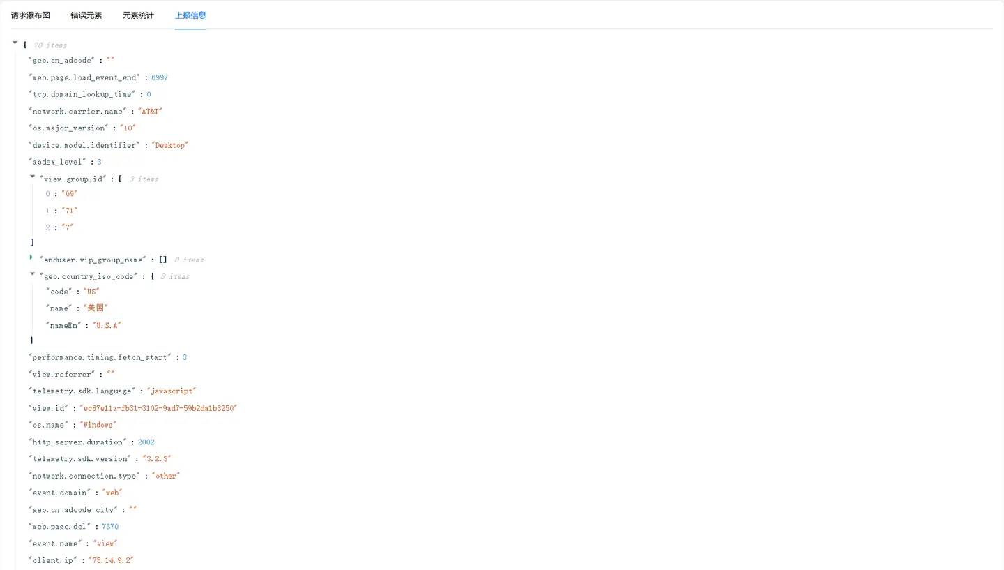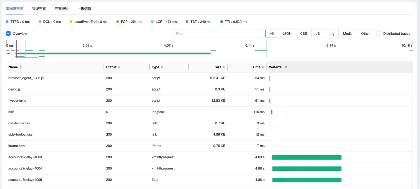 点击详情列表timeStamp,进入到Trace 详情追踪页面,该页面展示了页面加载过程中的请求信息。