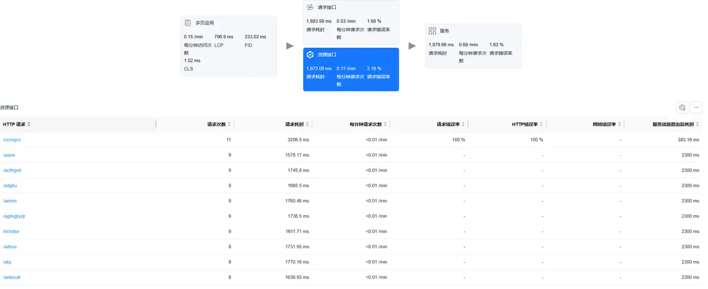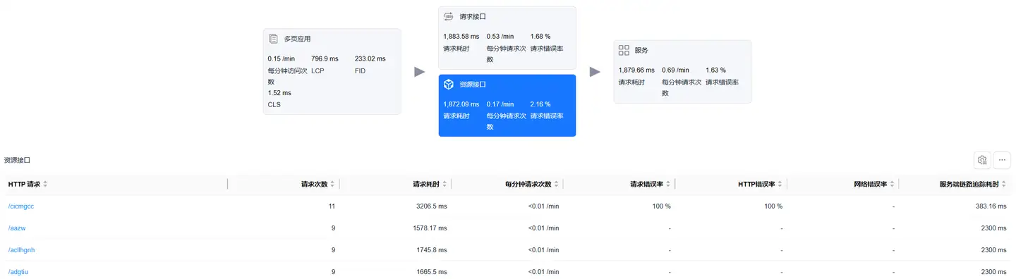 选中资源接口卡片,底部展示资源请求数据列表,列表展示数据包括: