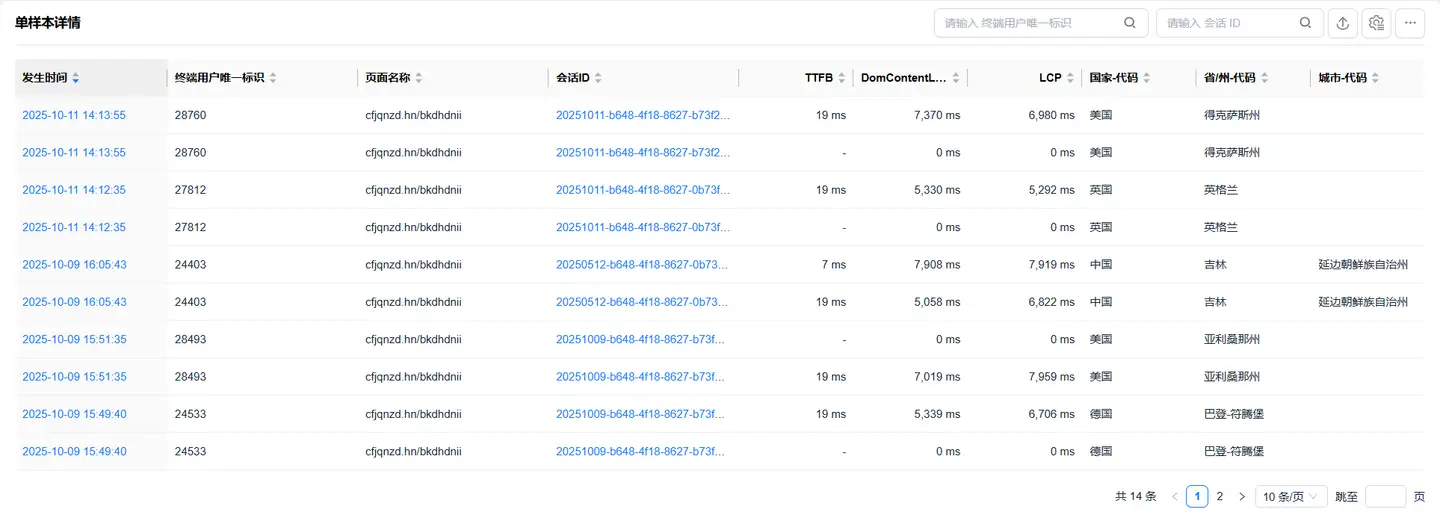 - 您可以在左侧筛选页面加载性能指标来分析其在不同地域的表现情况