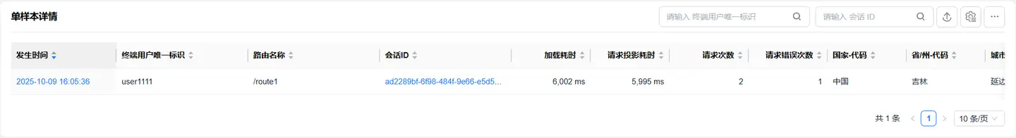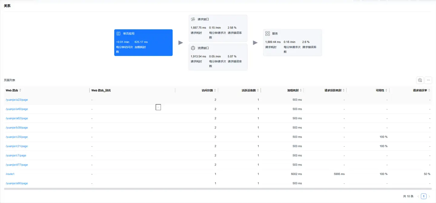 默认选中单页应用卡片,底部展示路由加载性能数据列表,列表展示数据包括: