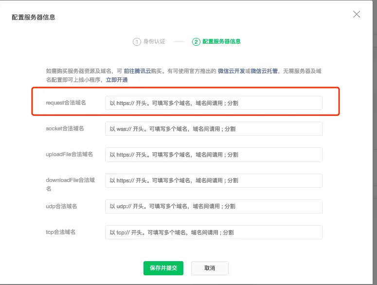 After copying the domain address, add the Tingyun server address that receives probe data to Development Settings > Server Domain > Request Legal Domain in the WeChat mini-program backend, as shown in the figure below: