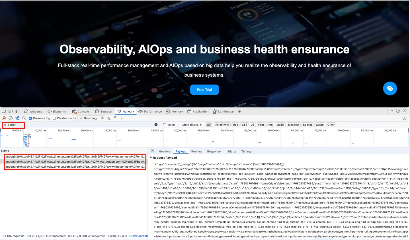Access the instrumented page through Chrome browser, press F12, then search for "action" in network. If there is action interface data, it means instrumentation is successful.