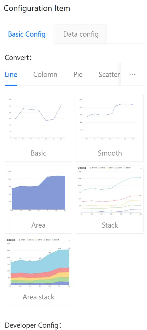 Select a chart, click the "Data Configuration" button on the right to configure the integrated data, click again to collapse the configuration area. Example as follows: