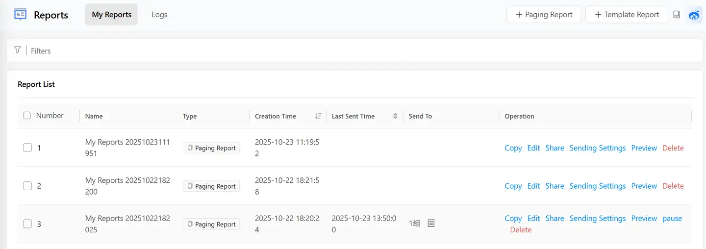 Search Reports: Click the search box in the upper right corner of the report list to perform a fuzzy search on reports.
