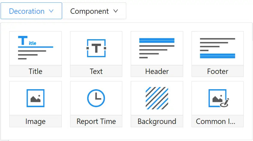 Decoration Area: Clicking the "Decoration" drop-down menu displays the decoration components pop-up. Decoration components support being used by clicking or dragging onto the canvas area.