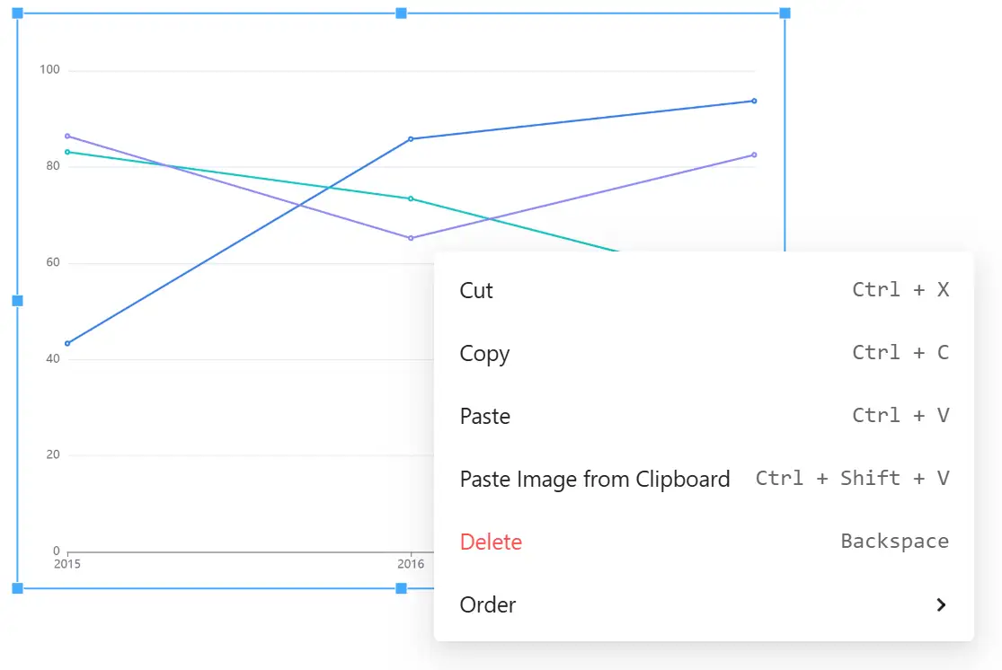Right-clicking on a chart allows you to: Cut, Delete, Copy, Paste, Paste from Clipboard, Bring to Front, Send to Back, Bring Forward, Send Backward.