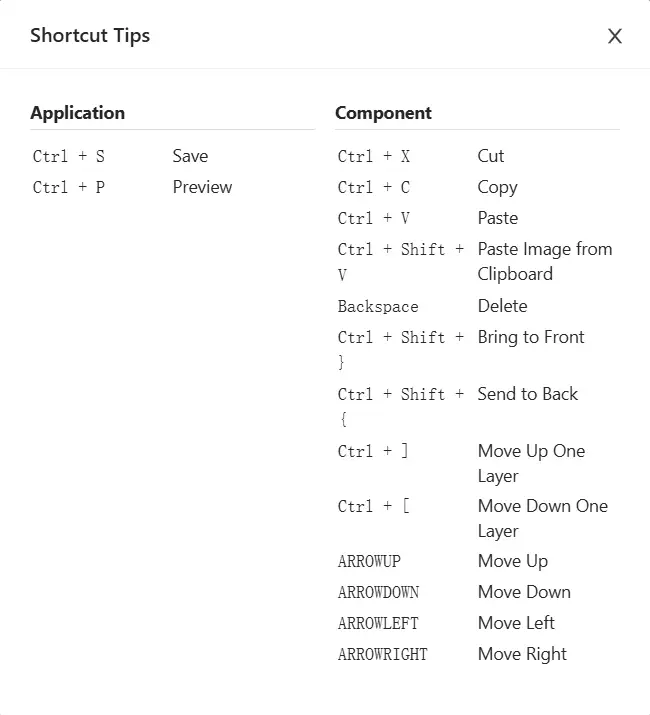 The entire canvas area supports keyboard shortcut operations. The shortcut functions are as follows: