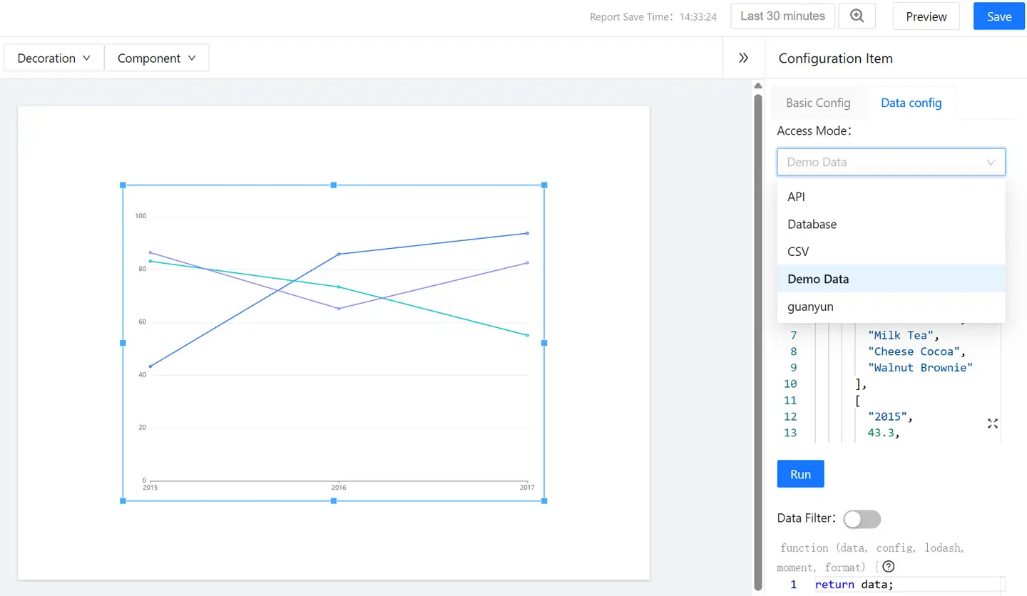 - Public Component Library Component Configuration: Configure data integration methods (including API, Demo data) and data filters.