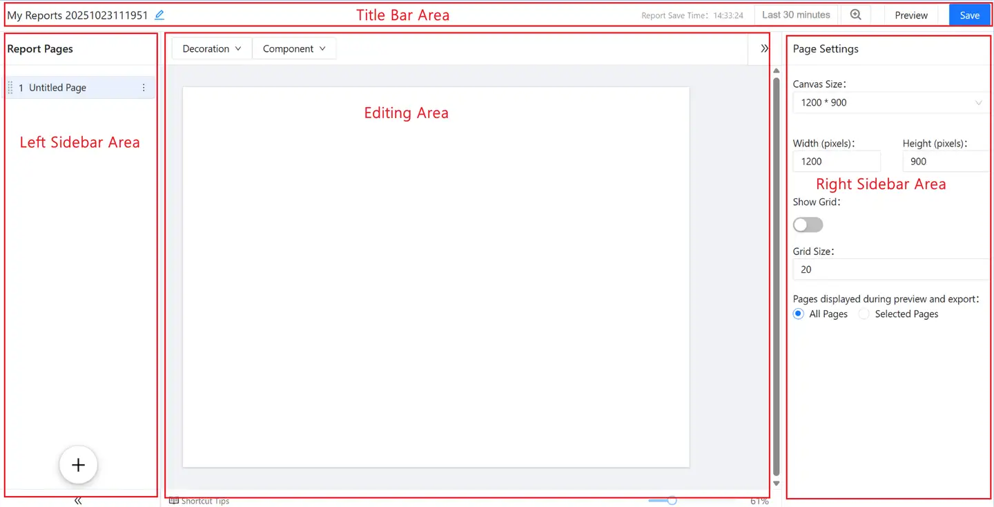 The Editing Area includes: the Decoration Area, the Public Component Library, and the Canvas Area. In this area, you can layout, format, perform quick operations, and select needed icons for the report.