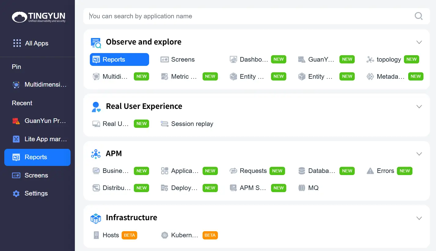 In the left navigation bar, select "All Apps", and then select "Observe and explore > Report" from the pop-up list of lightweight applications.