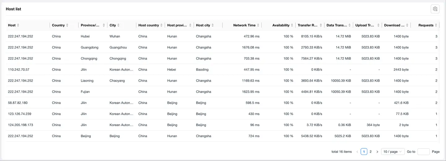 Displays detailed performance data of clients accessing each CDN node, supporting multi-dimensional analysis and problem localization.