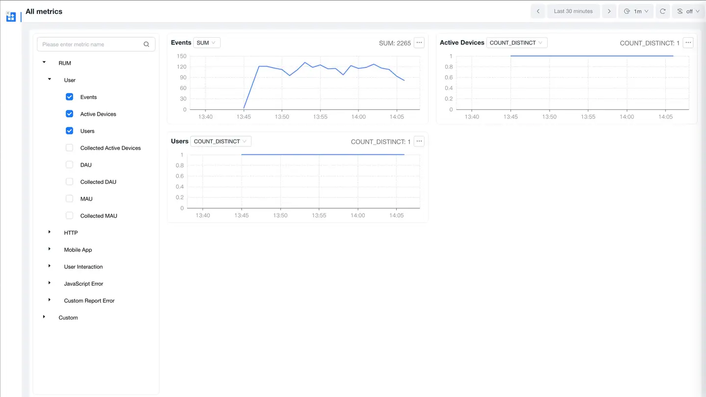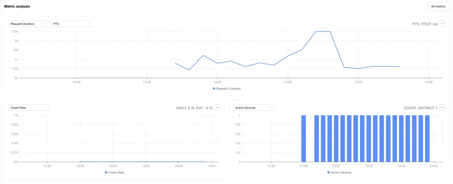 Displays trend charts of performance metrics. You can filter and analyze performance metrics as needed. Time-based performance metrics support average, P50, P75, P95, and P99 analysis, with P75 displayed by default. It supports analysis of active device count and startup count. Click on All Metrics on the right to enter the Metrics System page, which displays attribute information for each metric and supports metric search.