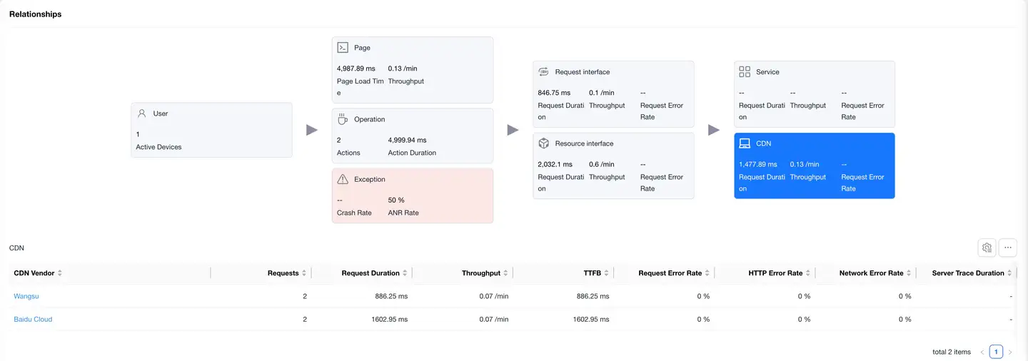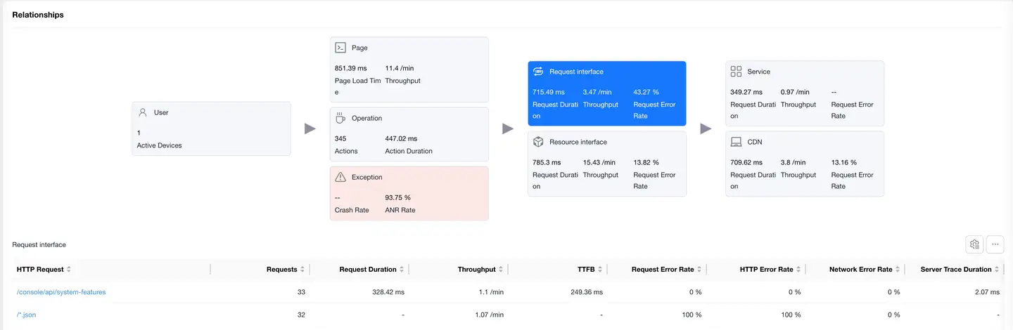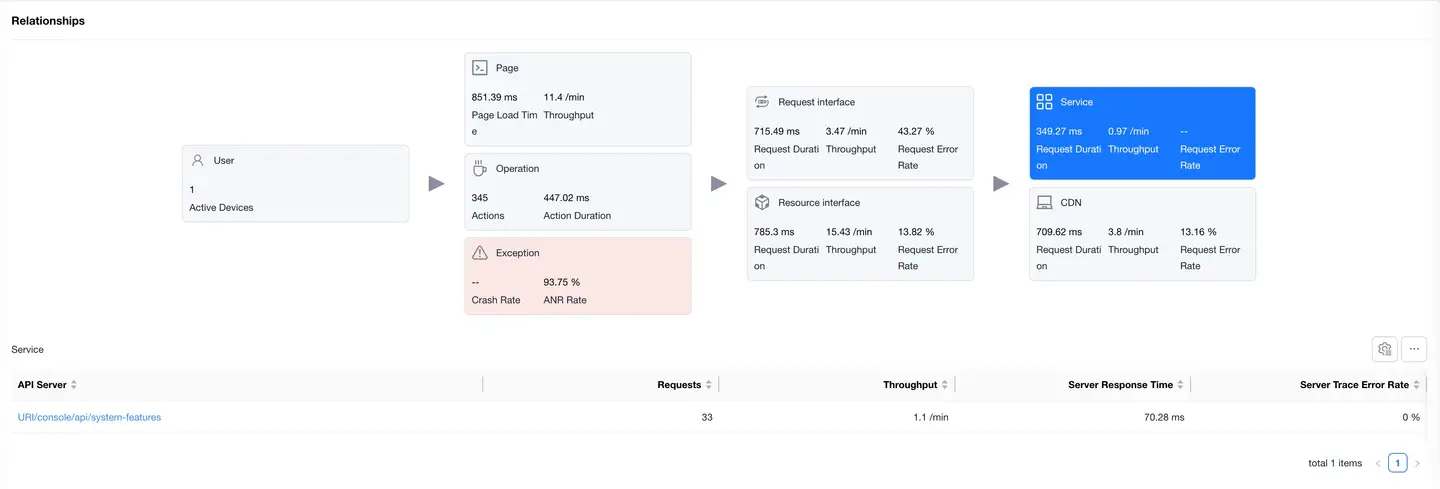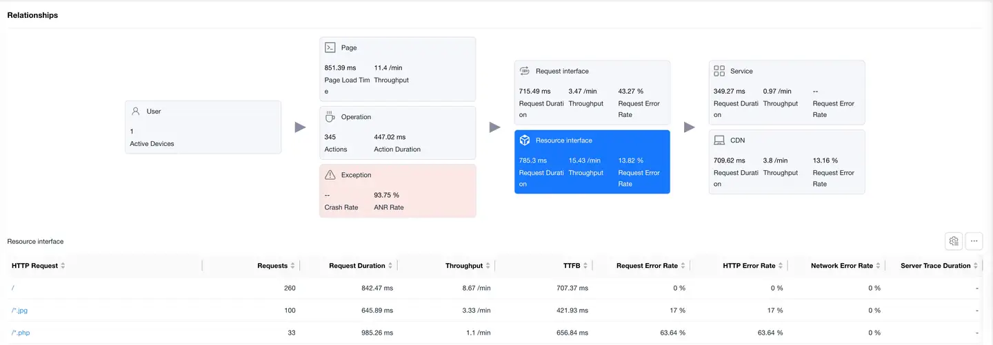 Displays the complete link between user experience and backend services, helping to analyze performance bottlenecks.