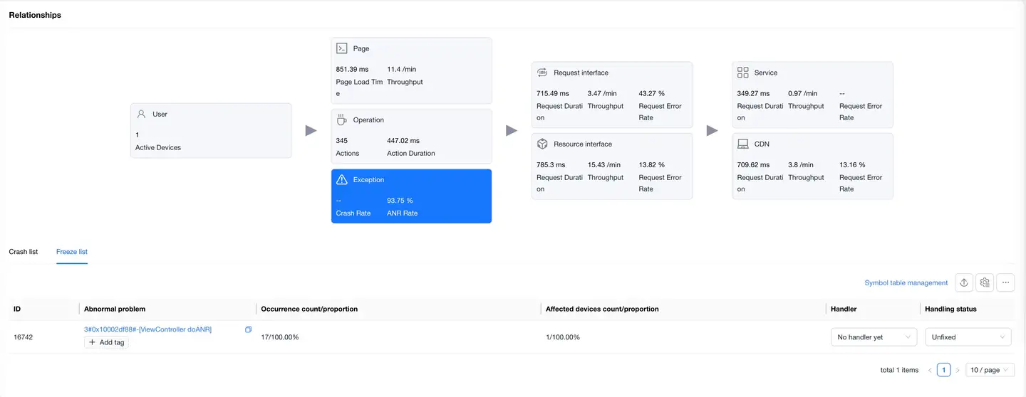 Select the Exceptions card to display the crash/freeze list. The list shows data including Exception ID, Exception Issue, Version, Occurrence Count/Percentage, Affected Device Count/Percentage, Handler, Handling Status. The list supports export and customizable headers, which you can configure as needed. Click on an exception issue to enter the Exception Detail Analysis, which displays detailed data for that exception.