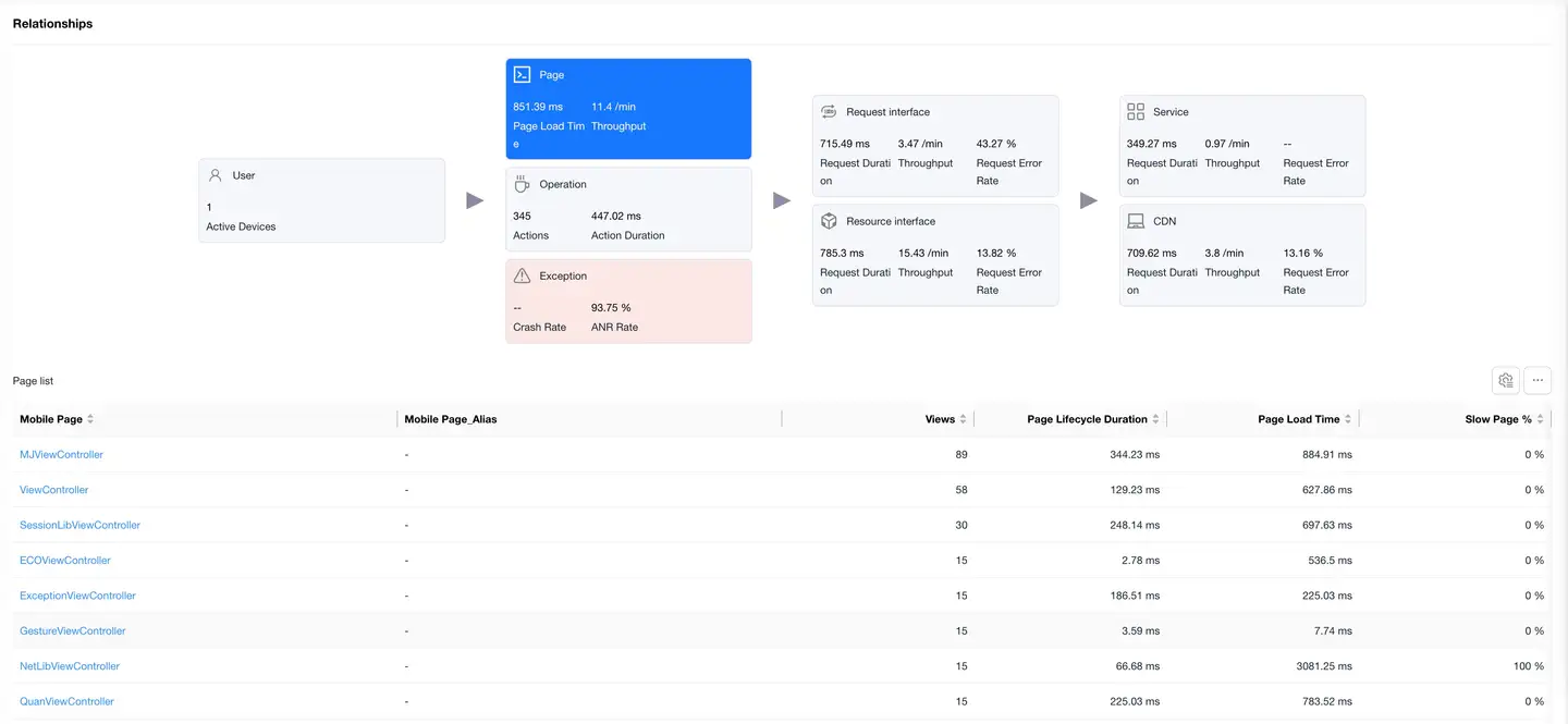 Select the Pages card to display the page performance data list. The list shows data including Mobile Page, Visit Count, Page Lifecycle Duration, Page Load Duration, Slow Page Percentage. Click on a page in the list to enter the Page Detail Analysis, which displays detailed data for that page.