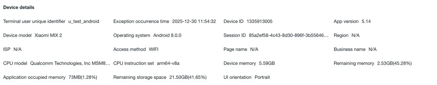 - Context information: UserID, abnormal occurrence time, session duration, device ID, application version, device model, operating system, region, carrier, access method, CPU model, CPU instruction set, device memory, remaining memory, application memory usage, remaining storage space, UI orientation.