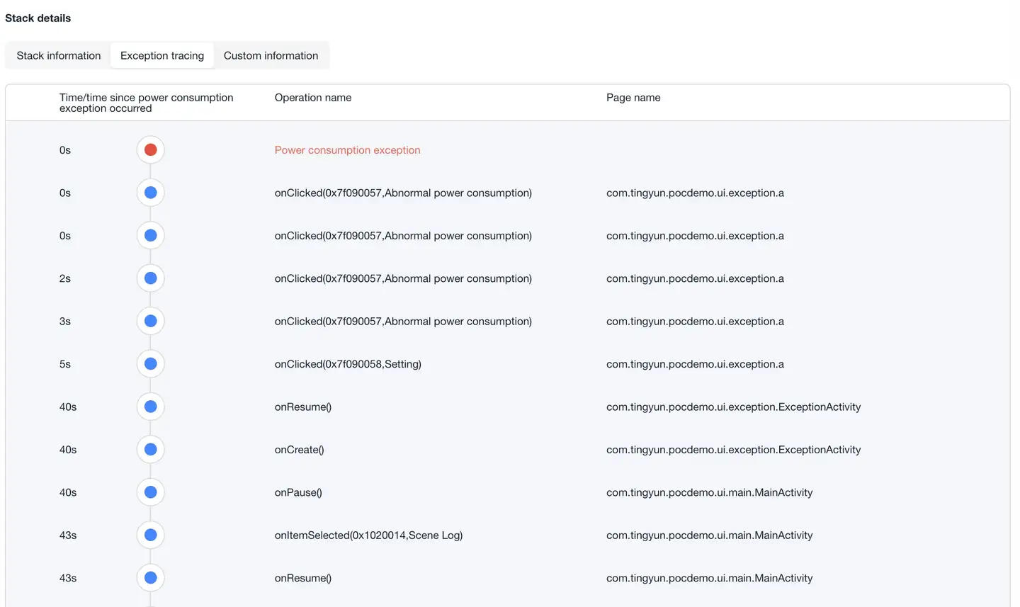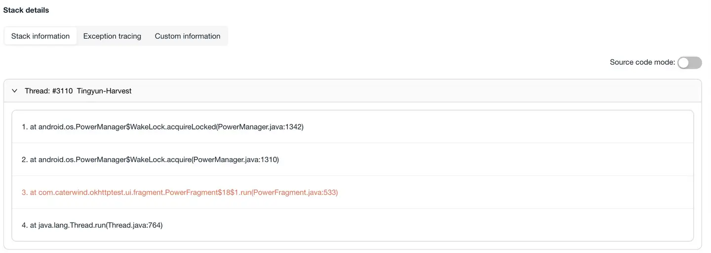 - Stack information: Thread call stack information where the abnormality occurred.