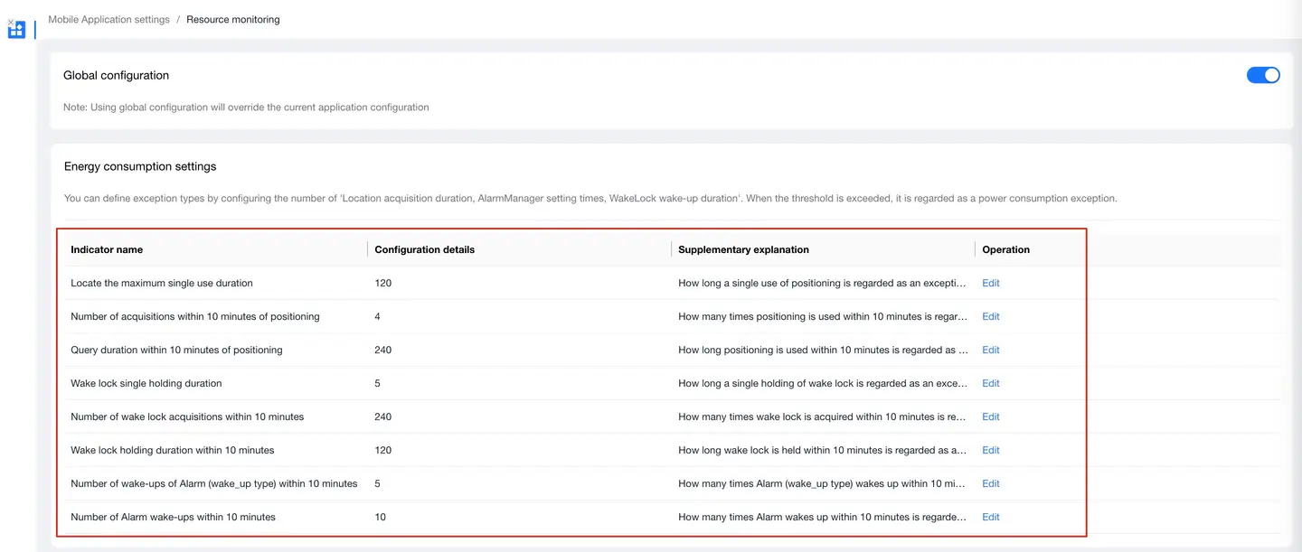 | Single wake lock holding duration | 5 | How long a single wake lock is held is reported as abnormal, in seconds. |