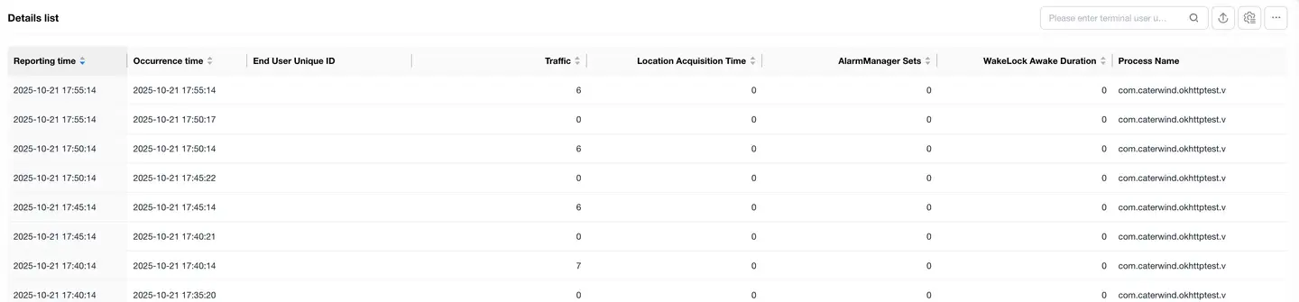Displays detailed data of power consumption attribution metrics; list data supports export. You can click the + on the left to expand and view the context information of each power consumption attribution data "occurrence time, UserID, device ID, application version, device model, operating system, region, carrier, access method, CPU model, CPU instruction set, process name"