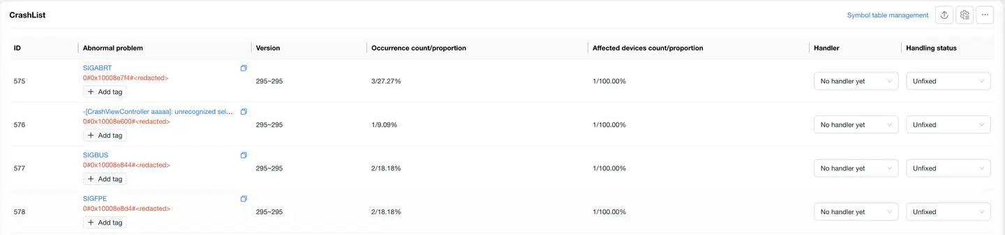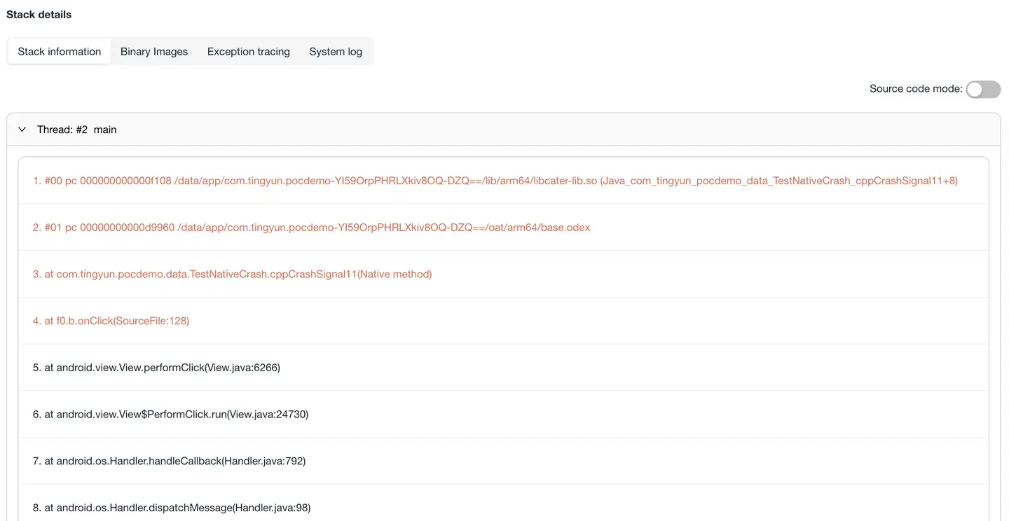 To quickly locate the problem code location, the system uses symbol table files to parse exception stacks: