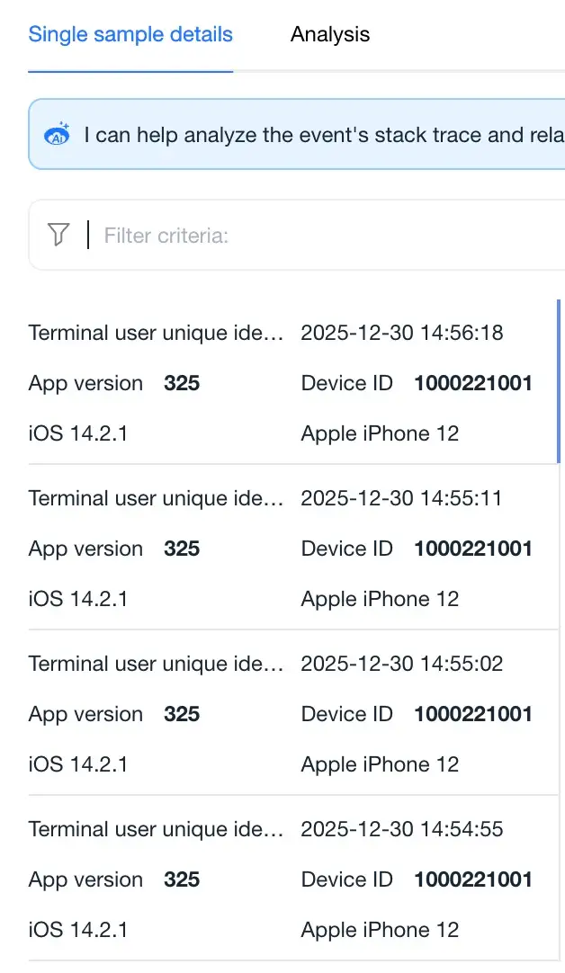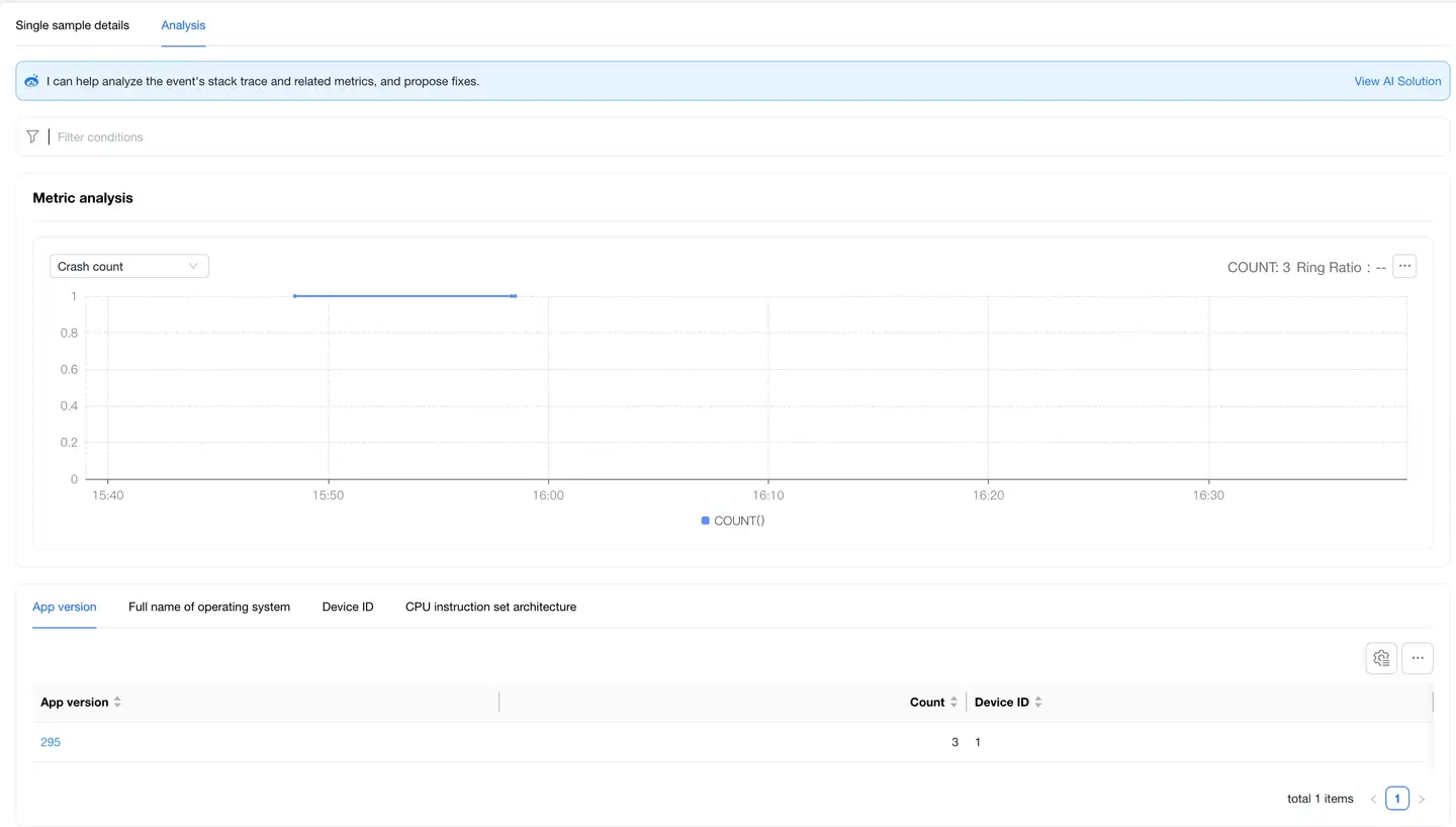 Click Exception Analysis in the left navigation bar to enter the exception analysis overview page and view the overall and single sample exception information of the current application.