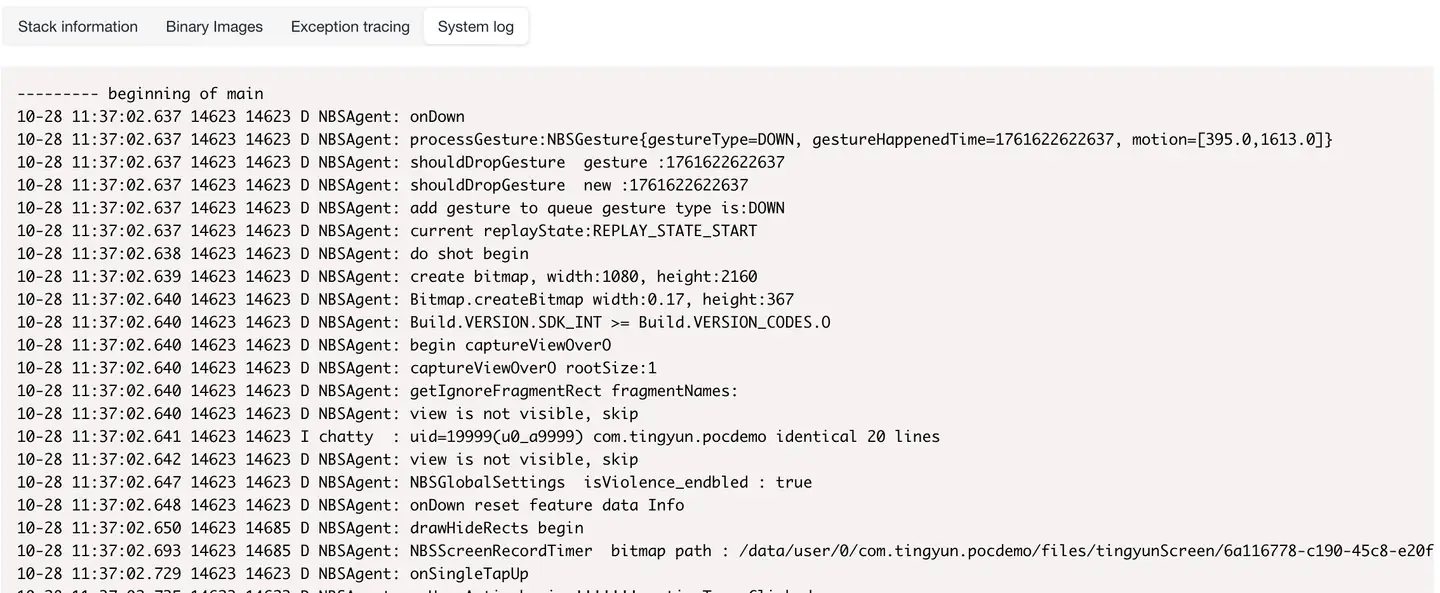System Log: For Android SDK, users can customize system logs. After definition, a new System Log tab will be added to the Crash Details page.
