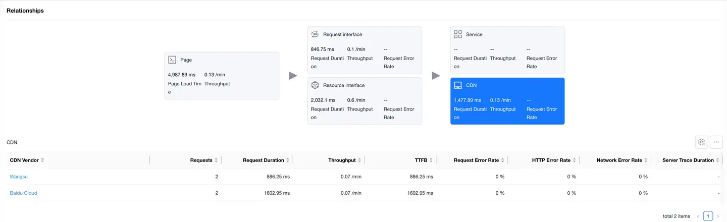Select the CDN card to display the CDN vendor data list. The list shows data same as request interfaces.