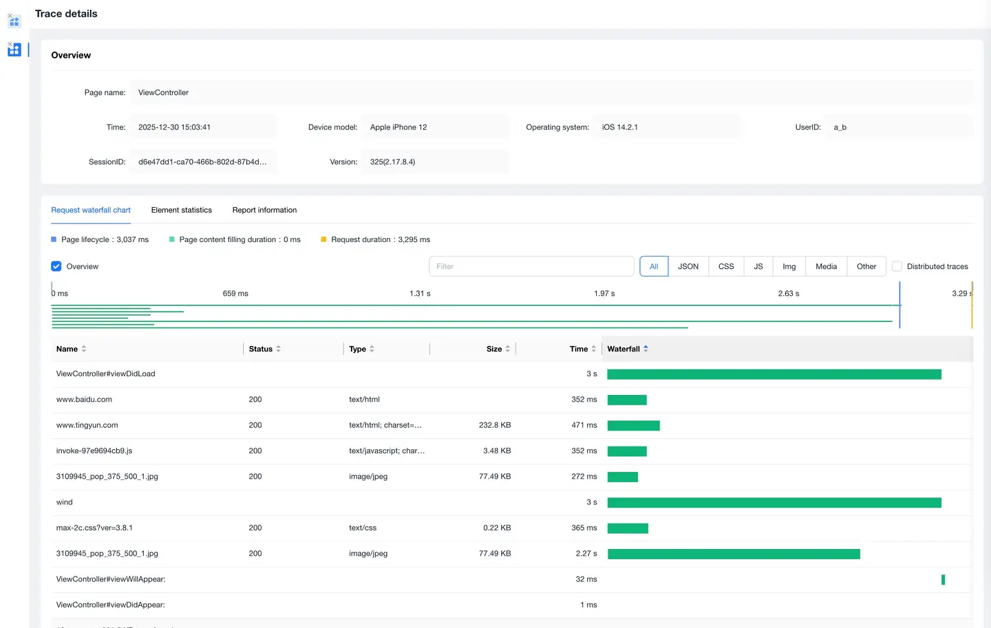 Click on the timeStamp in the details list to enter the Trace Detail Tracking page, which displays the request information during page loading.