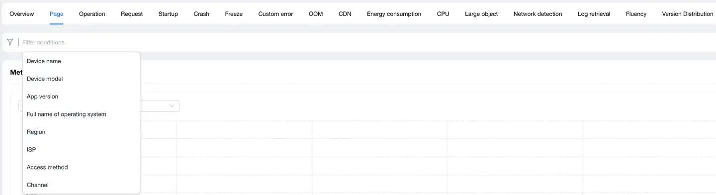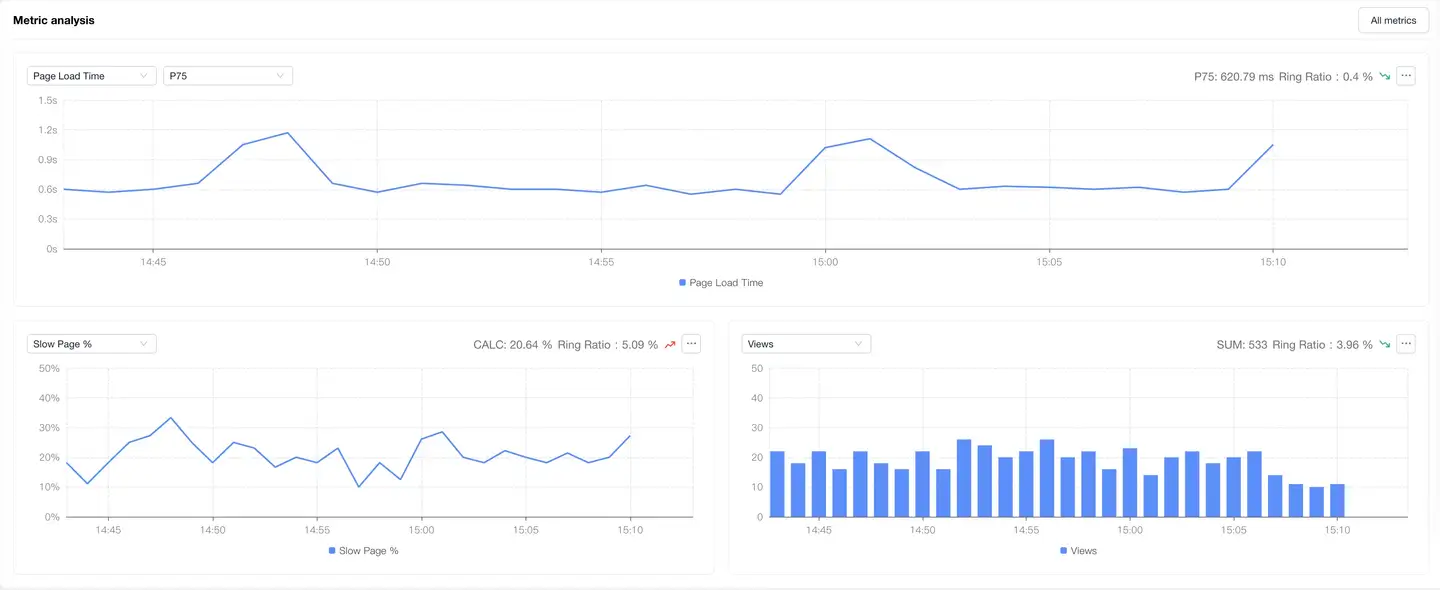 Displays trend charts of page performance metrics under filter conditions. You can filter and analyze performance metrics as needed. Time-based performance metrics support the following value analysis, with P75 displayed by default: