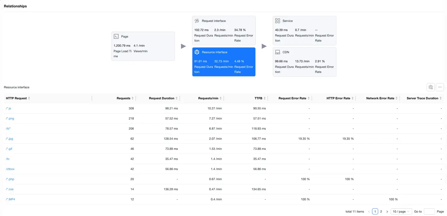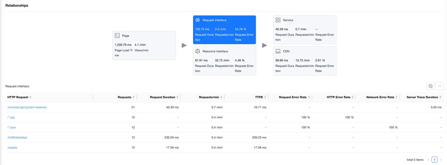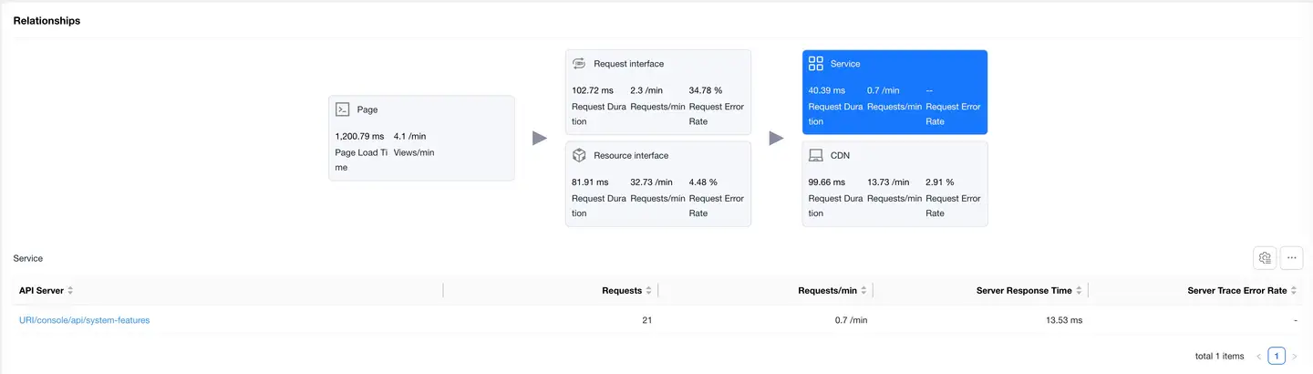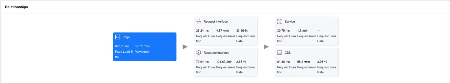 Displays the complete link between application page loading and backend services, helping to analyze performance bottlenecks.