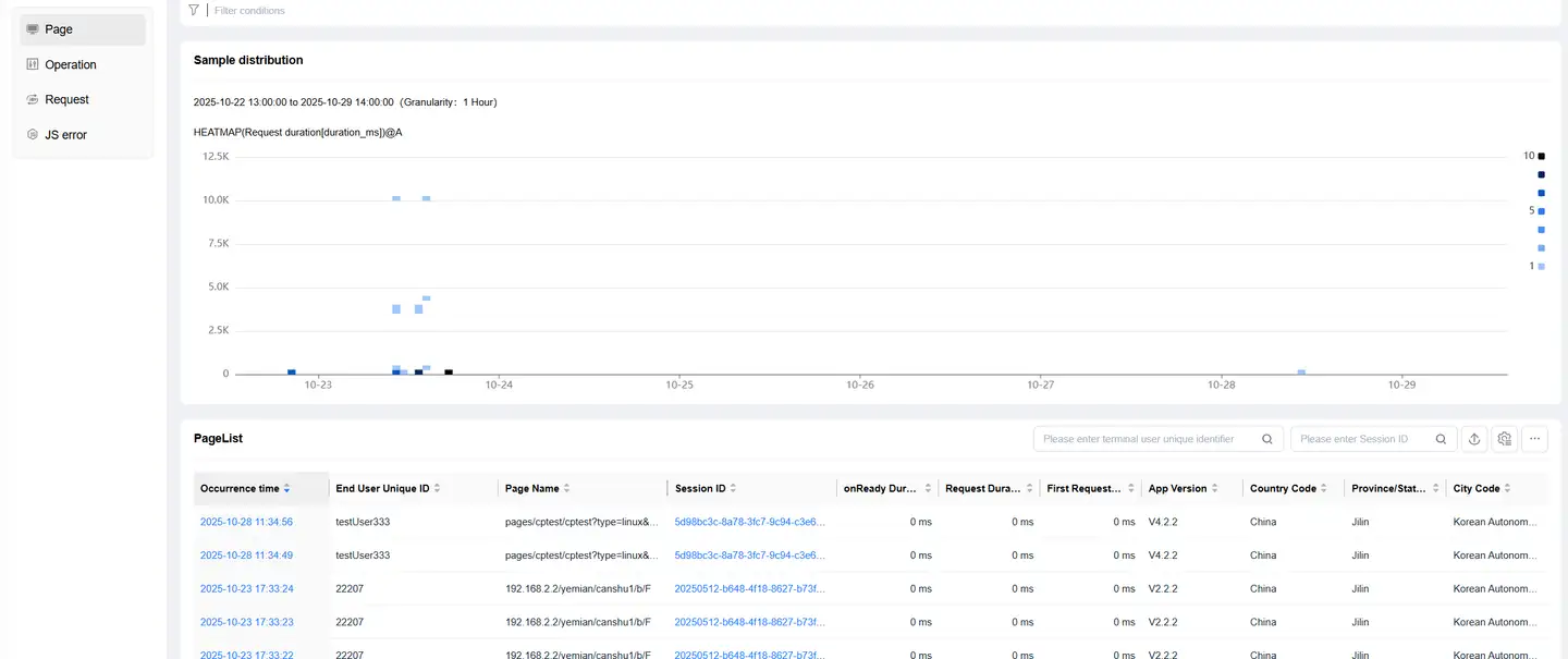 User tracking allows you to view page and operation sample data by filtering through UserID or SessionID. It also provides detailed page views.