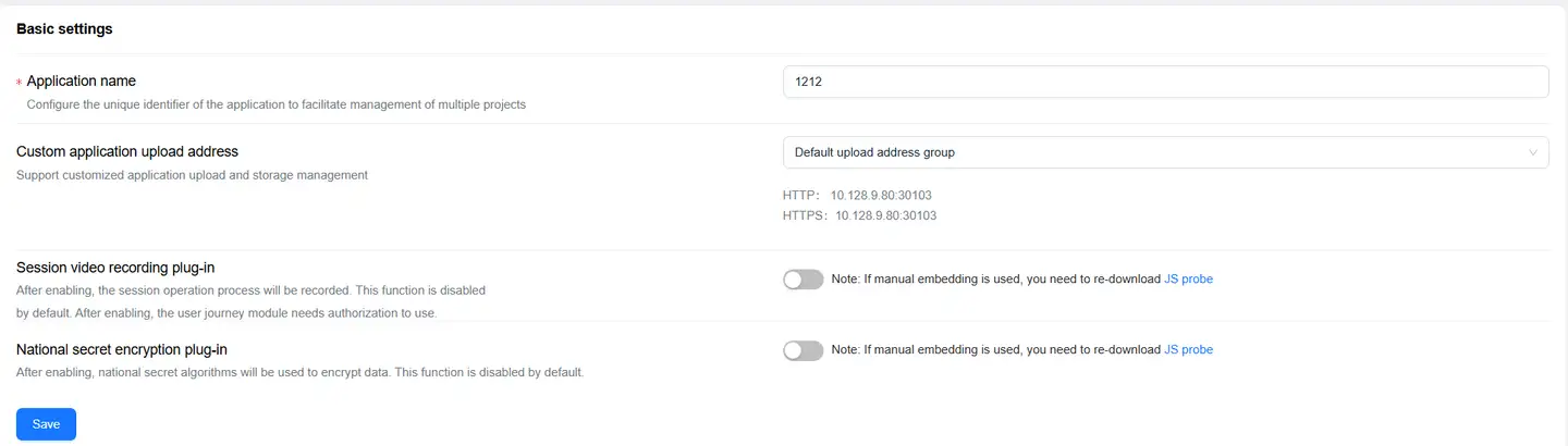 Basic settings are mainly used to set the application name, upload address custom application upload address, session video recording plugin, and SM2 encryption plugin.