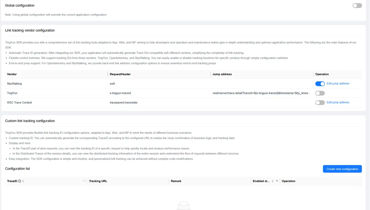 https://wukong.tingyun.com/web/server/trace-detail/tx/0101/010101010101?timestamp=1010101010101, you need to set the tracking URL tohttps:/wukong.tingyun.com/web/server/trace-detail/tx/${appId}/${traceId}?timestamp=${tyTimestamp}. This item is optional. - Remarks: Description of this configuration item. This item is optional.