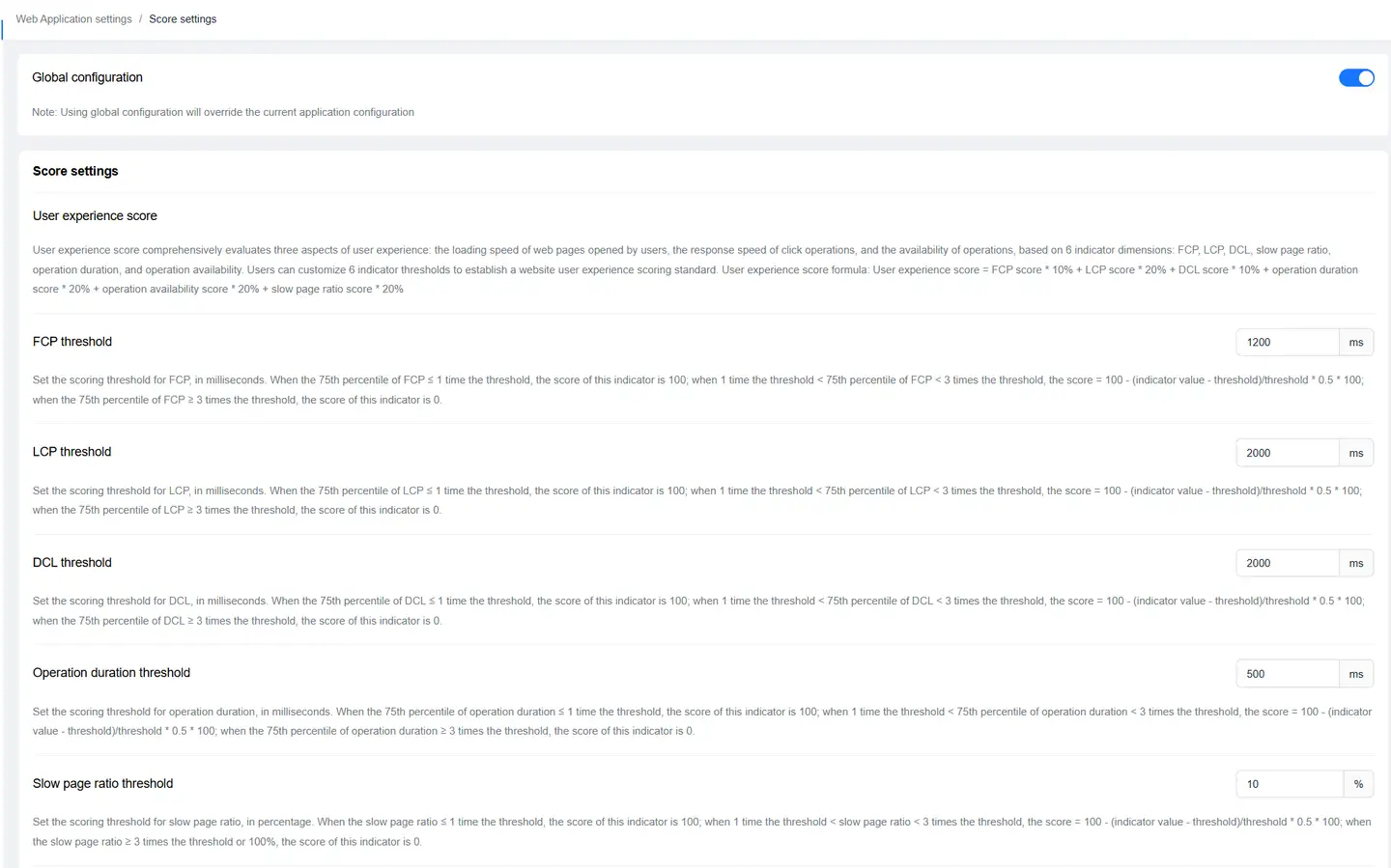 The user experience score uses FCP, LCP, DCL, slow page percentage, operation time, and operation availability, 6 metric dimensions to comprehensively score the loading speed of web pages opened by users, the response speed of click operations, and the availability of operations. Users can customize the thresholds of the 6 metrics to establish a scoring standard for website user experience.