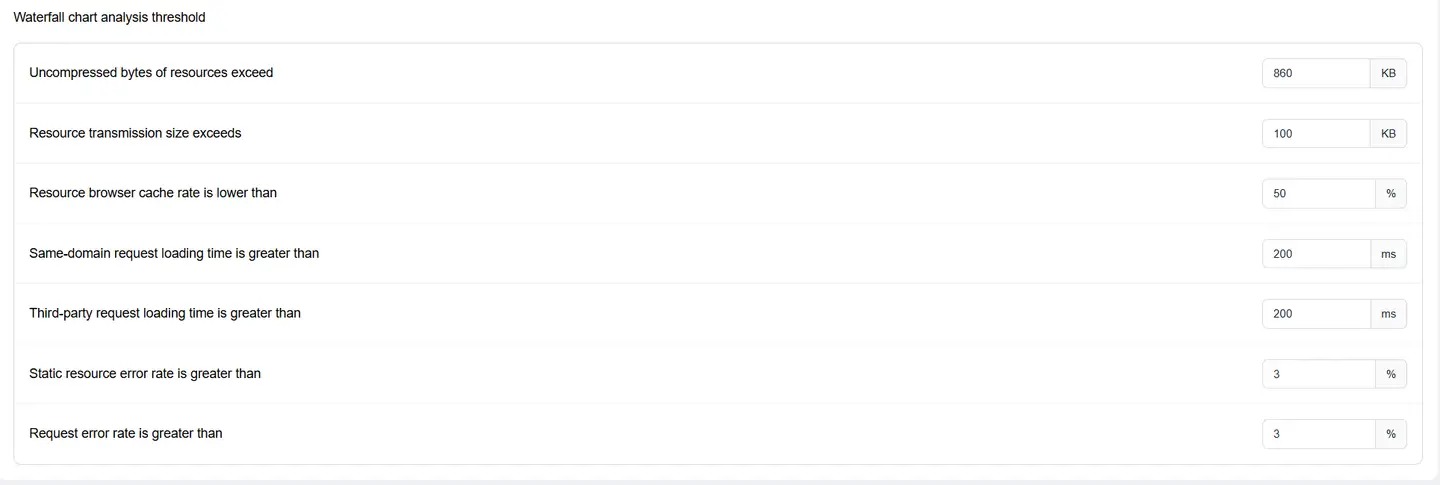Set the performance threshold for slow page tracking, in milliseconds. When any of the four metrics of page access full load, FCP, LCP, and DCL exceeds this threshold, the browser agent will record detailed page loading data, including public IP, network environment, page element loading waterfall chart, and other information.