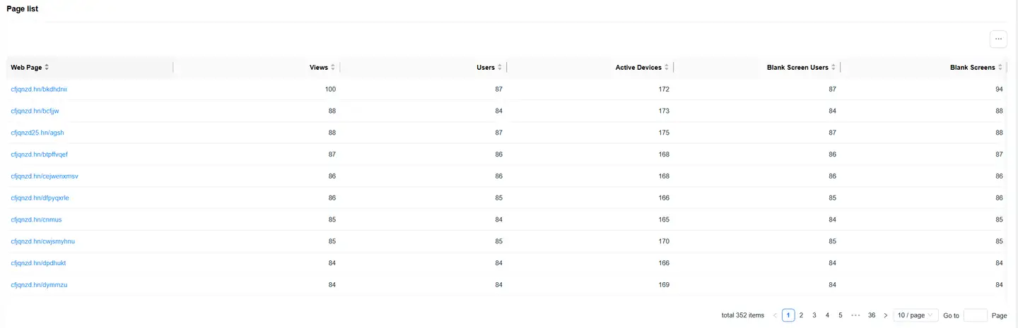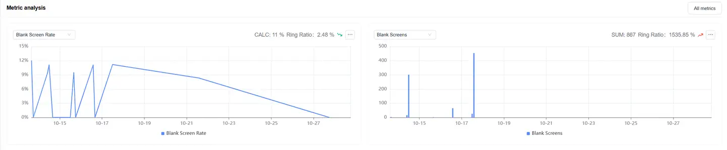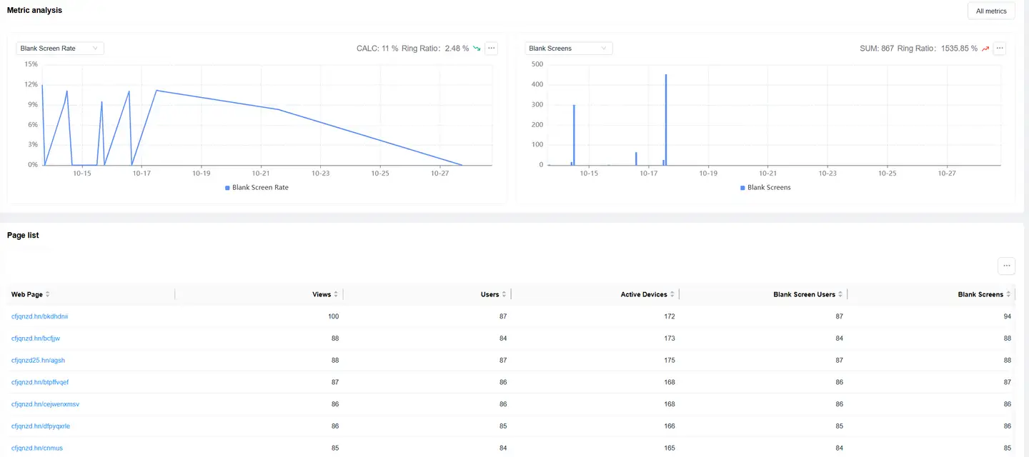 Blank screen analysis helps you monitor and analyze blank screen issues that occur during webpage loading, promptly discovering and resolving blank screen failures that affect user experience.