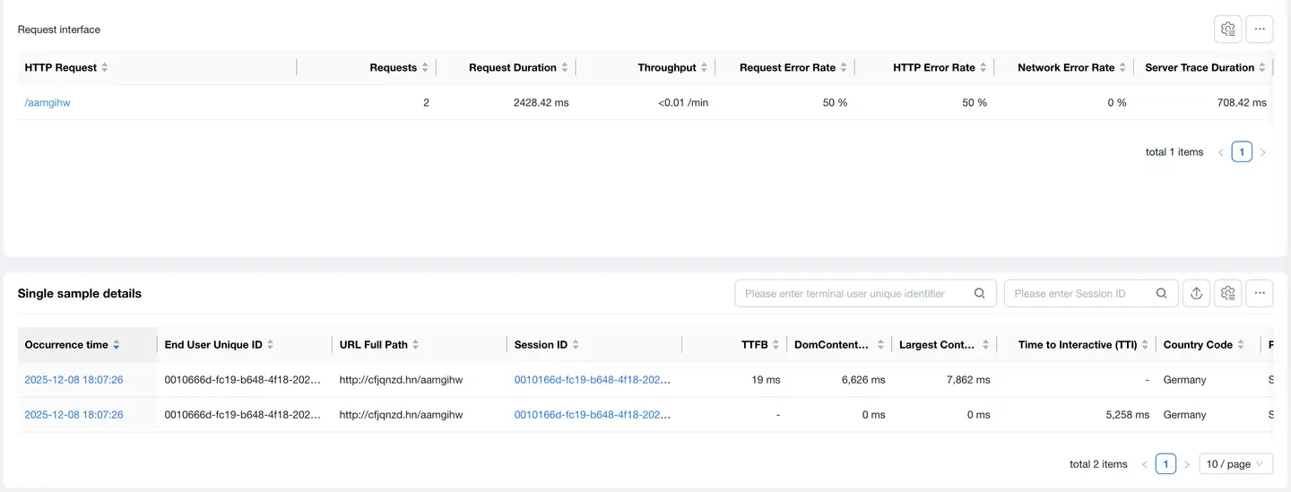 Click on an HTTP request to enter Request Detail Analysis, which displays detailed data for that HTTP request.