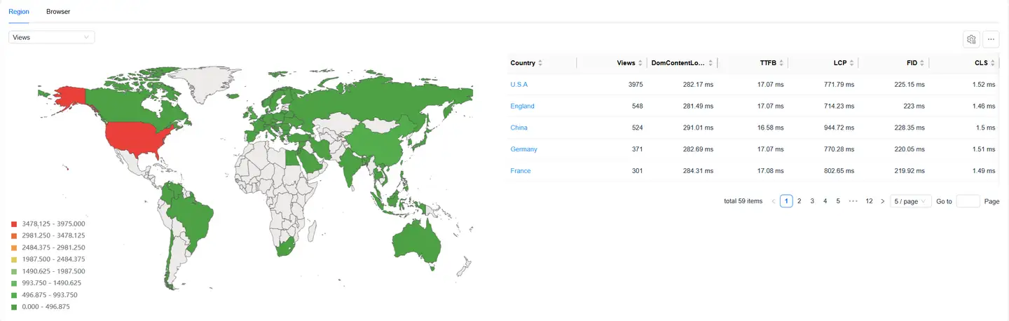 - You can filter page loading performance metrics on the left to analyze their performance across different regions
